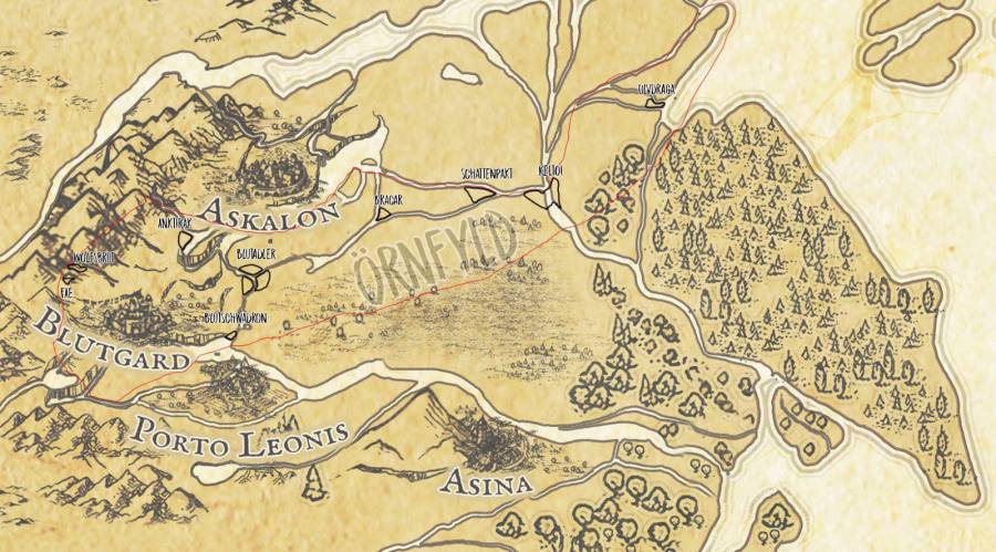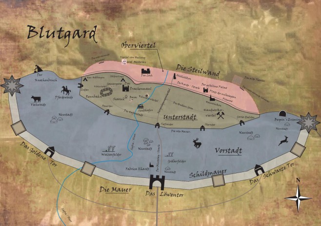 Blutgard, die Stadt, welche in den Stein der Bucht von Heolysos hineingehauen ist, gleicht viel eher einer Festung. Zahlreiche Geheimnisse ranken sich um die tiefen Katakomben und geheimnisvollen Feenwälder, die sich in der neuen Heimat des Blutpaktes befinden.